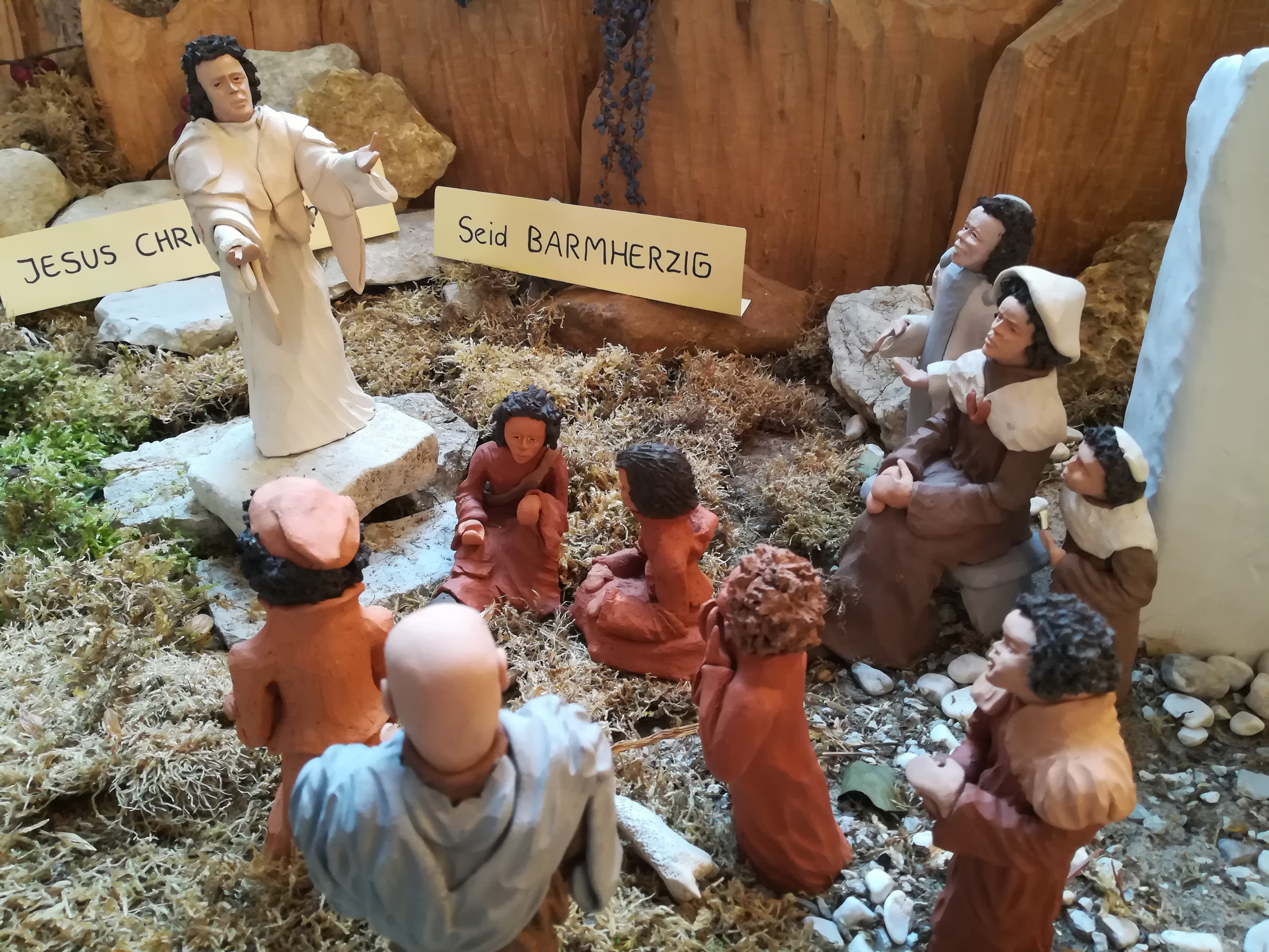 Unsere Kirchenkrippe (am Südausgang) lädt ein, die Jahreslosung „Seid barmherzig wie auch Euer Vater barmherzig ist“ (Lukus 6,36) mit den Figuren von Klaus Weigand (Wonsees) auf sich wirken zu lassen.