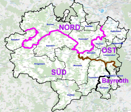 Der Dekanatsausschuss hat im Zuge der Landesstellenplanung zusammen mit den Kirchengemeinden unser Dekanat in 3 Regionen aufgeteilt. Kasendorf gehört mit Peesten, Buchau und Weismain zur Region Nord. Siehe Skizze: