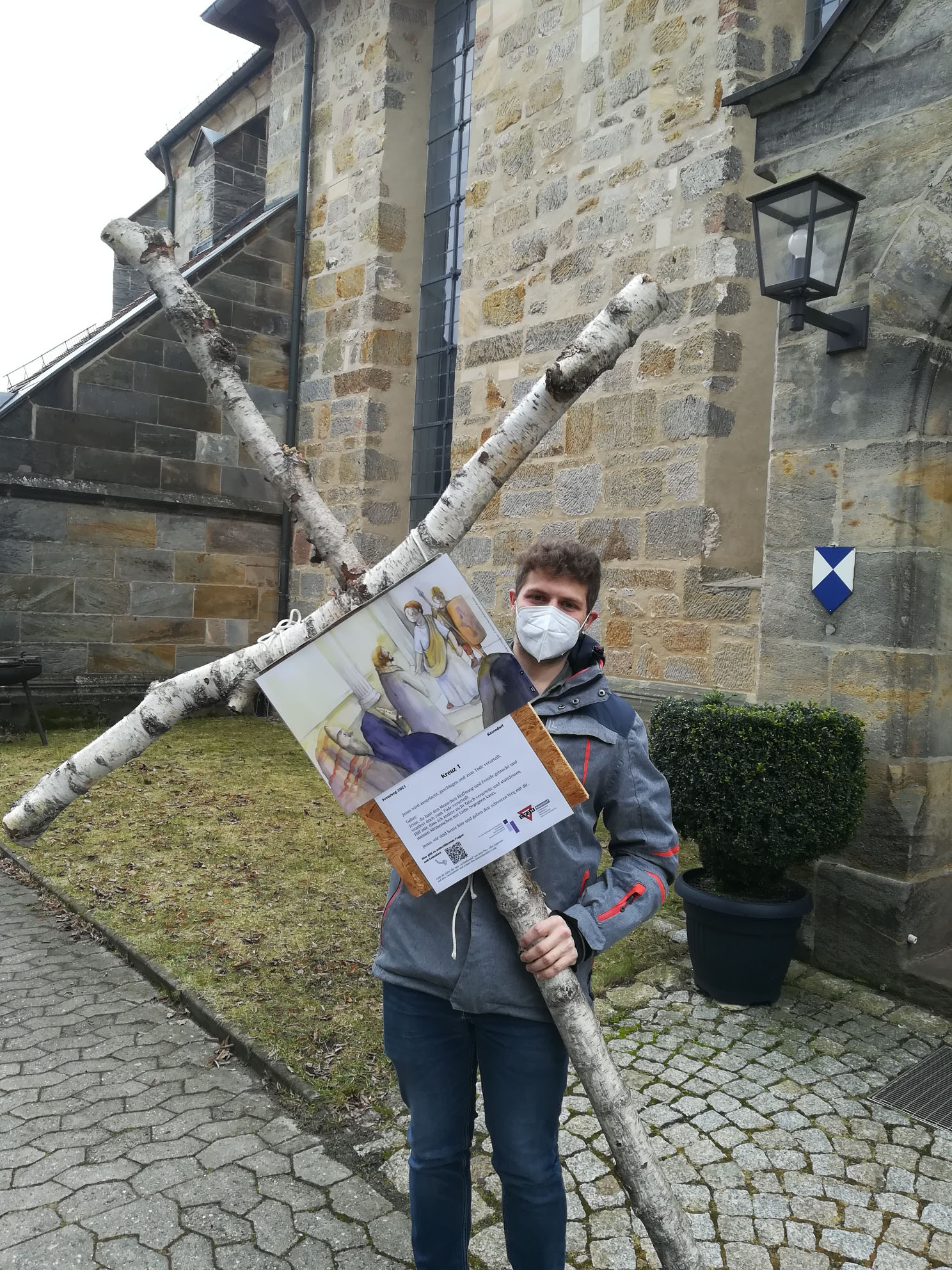 Philipp Hacker, Jugendsprecher des Marktes und Mitglied im Leitungsteam des Jugendtreffs M2, stellte die acht Kreuze fast im Alleingang auf (von der Kilianskirche über den Festplatz und Simonweg zum Magnusturm). Die Bilder an den Kreuzen, auch für Familien mit Kindern, wurden mit Gebeten von Sarah Stoffers (FSJlerin) vertieft.