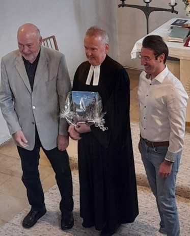 Am Ende des Gottesdienstes stand nicht Michael Müller an der Eingangstür der Kirche, um seine Gemeinde zu verabschieden, sondern wurde vom Spalier stehenden Gesangverein mit Blumen beschenkt. Sichtlich gerührt war nicht nur er selbst, sondern auch viele der Gottesdienstbesucher. Seinen „Stammgästen“ überreichte Pfarrer Müller ein kleines Andenken, das im wahrsten Sinne des Wortes von Herzen kam.